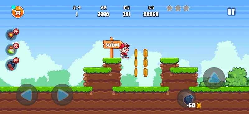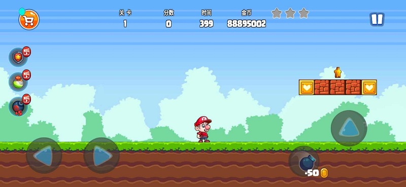 3、游戏操作采用经典的虚拟按键布局,左右方向键控制角色移动,跳跃键实现各种精准动作。玩家可以跳跃顶击爱心方块获取额外分数,同时要时刻注意躲避移动的障碍物和危险的陷阱,灵活运用各种操作技巧才能顺利通关。