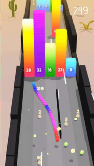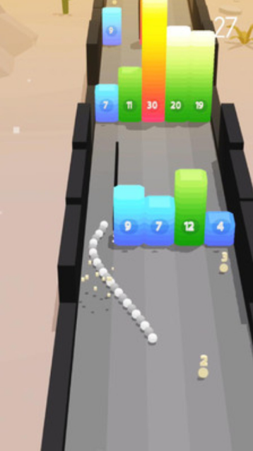 2.通过吃掉其他小球来壮大自己的队伍,随着小蛇不断变长,玩家需要更加灵活地操控方向,避开各种障碍物和陷阱;