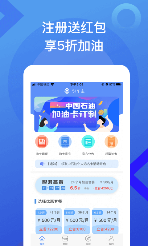 作为中国石化、中国石油官方合作的加油卡在线充值平台,51车主APP提供最低5折的充值优惠。支持支付宝、微信等多种支付方式,全国通用,操作简单快捷。系统实时更新油价信息,让您随时掌握最优加油时机,是车主必备的省钱利器。