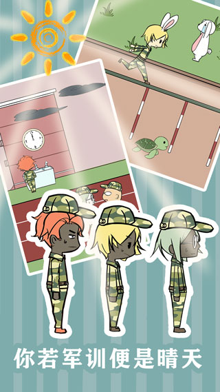 3、游戏真实还原了军训时的炎热环境,玩家可以感受到烈日当头的煎熬。通过创意解谜,玩家可以为主人公寻找各种降温妙招,比如制造人工降雨或寻找阴凉处,体验别样的军训乐趣。