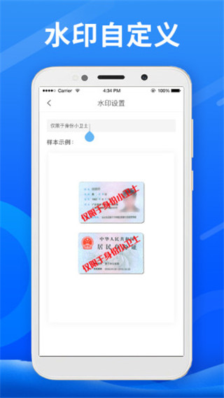 1、个性化水印功能:支持自定义添加文字、图形水印,有效防止证件信息被恶意盗用,为您的隐私安全提供多重保障;