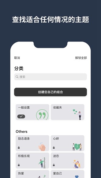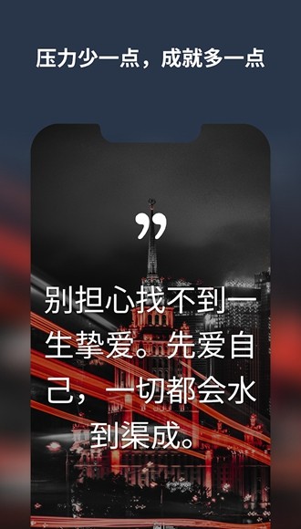本应用程序包括广泛多样的主题,例如自尊、人际关系和减压;另外亦提供一系列精心设计的格式供您选择——我们的内容团队每周新增200+条经过严格筛选的优质语录,并邀请用户参与"金句创作大赛",让普通人的智慧也能照亮他人。