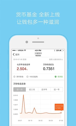 3、超低投资门槛设置,最低10元起投,让小额闲散资金也能获得稳健收益,真正实现全民理财;