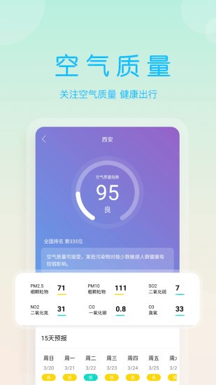 【空气质量】新增污染物浓度实时地图,可查看PM2.5、臭氧等6项污染物的空间分布,支持空气质量改善趋势预测和健康防护建议。
