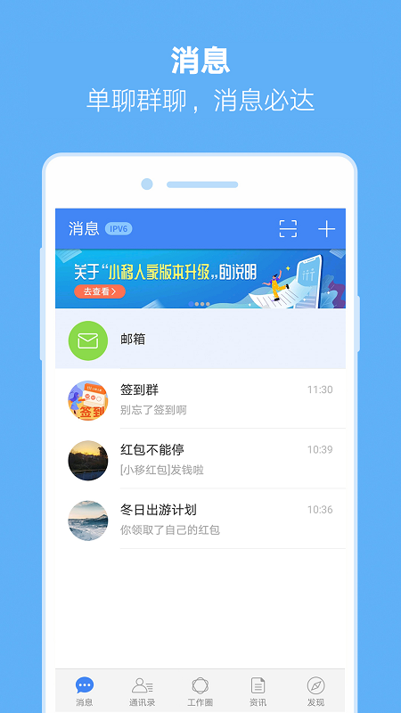 《小移人家》是中国移动专为企业员工打造的一站式沟通协作平台,集即时通讯、企业邮箱、智能通讯录、工作社交圈等功能于一体。作为企业内部高效协同的数字化工具,它不仅实现了57万员工的无障碍连接,更通过创新的"鸡毛信"消息必达机制和智能化任务管理系统,重新定义了移动办公场景。平台整合了公告发布、电话会议、知识共享等核心办公需求,既是中国移动人的专属社交网络,又是提升组织效率的智能工作台,真正实现了"沟通零距离,协作无界限"的现代办公理念。