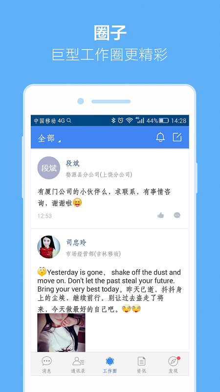 --工作圈:打造企业专属社交平台,支持图文动态发布、点赞评论互动,既可分享工作成果也能展示个人风采;