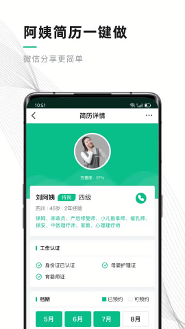 1.手机在线录入阿姨简历功能让家政服务更智能,用户可随时创建并预览阿姨资料,一键分享给雇主或阿姨本人,大幅简化家政老师的操作流程。系统支持多种简历模板选择,自动生成专业版式,让简历制作既高效又美观,帮助家政公司提升服务品质。