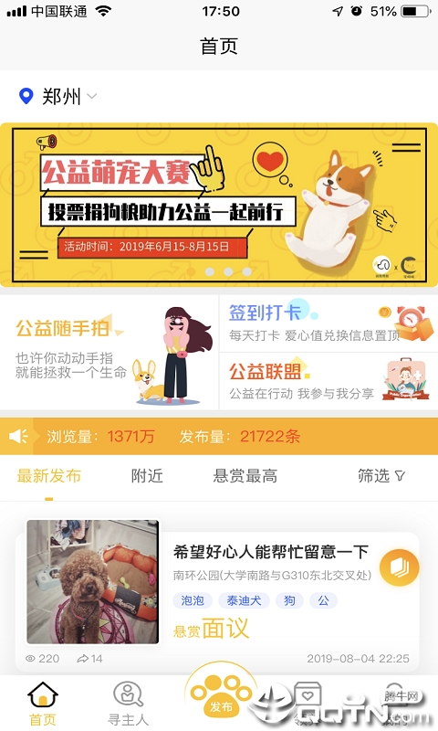 找狗寻狗App是一款专为宠物主人打造的智能寻宠平台,致力于帮助丢失爱犬的用户快速找回宠物。通过先进的智能匹配系统,用户可以一键生成专业的寻宠启事,并广泛发布至社交平台。该应用整合了全国范围的寻宠资源,提供高效的互助服务,让寻宠过程更加便捷。无论是走失的狗狗还是其他宠物,都能通过这个平台获得更多找回机会,让爱心人士共同参与寻找。