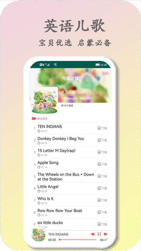 【英文儿歌乐园】收录大量经典英文童谣和律动儿歌,涵盖动物、自然等主题。纯正发音配合生动旋律,为孩子打造沉浸式英语学习环境,轻松开启语言启蒙。