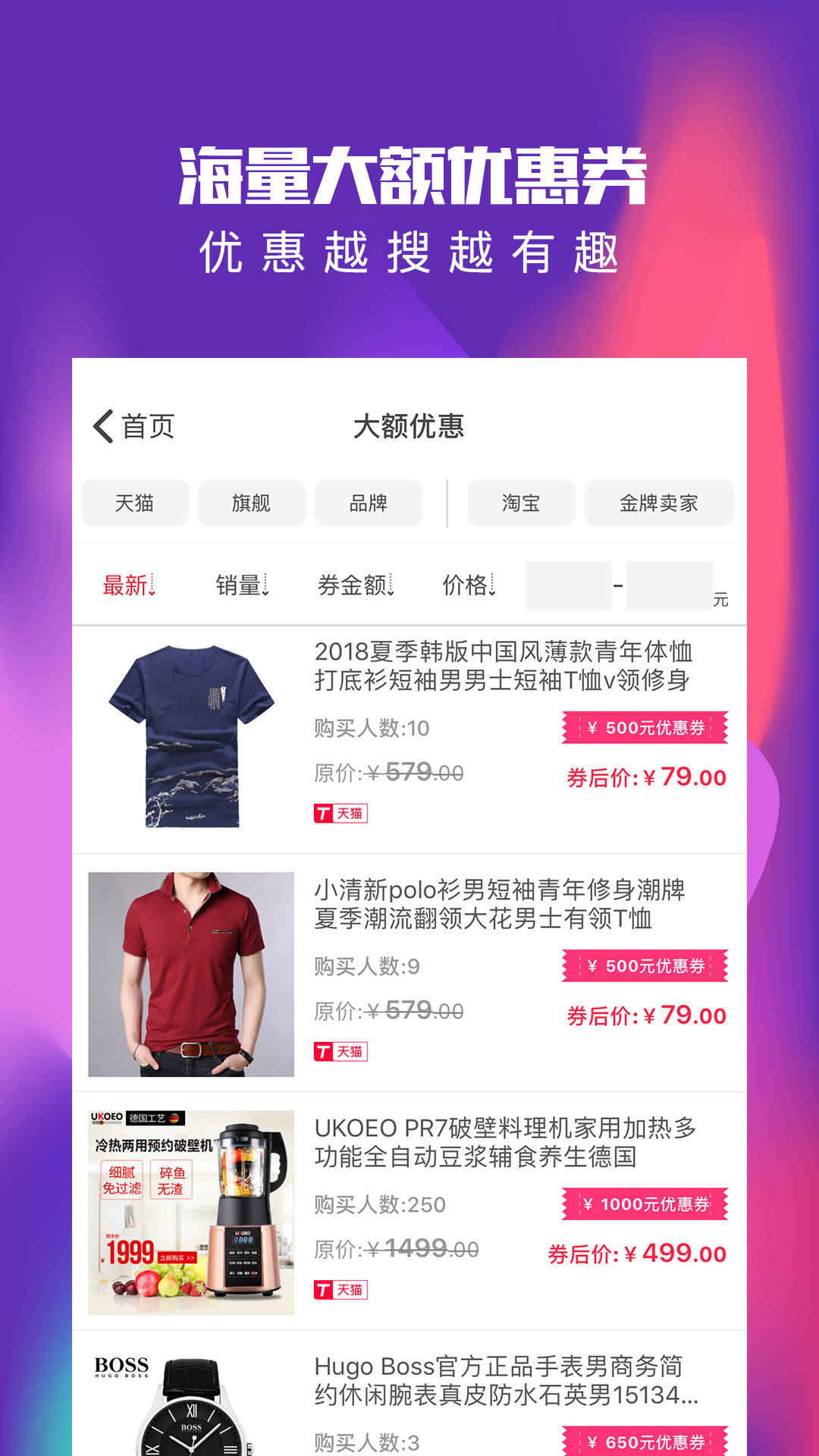 巨额优惠:每日更新海量高额优惠券,部分商品优惠力度高达50%以上,让用户享受真正的实惠。