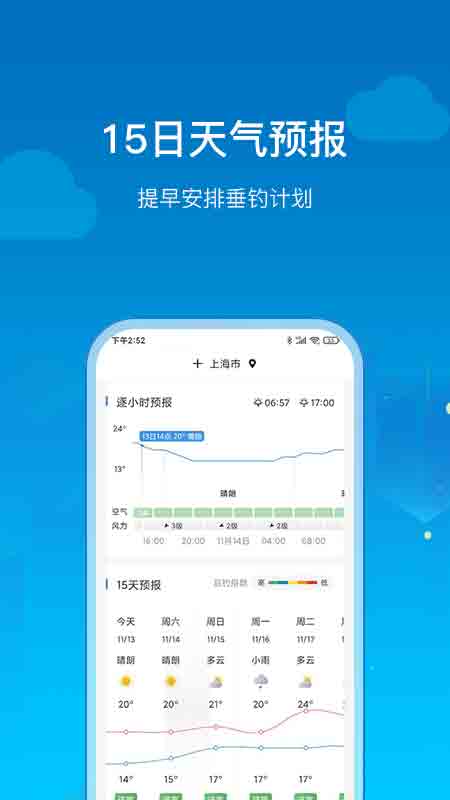 5、实时钓鱼天气:提供分钟级更新的高精度天气预报信息,包括天气状况、温度、气压、湿度、云量、能见度、风力风向、日出日落时间等钓鱼人最关心的气象数据。这些实时更新的信息能够帮助钓友随时掌握天气变化,做出正确的垂钓决策。
