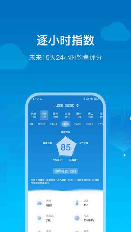 4、15日逐小时指数:基于天气、温度、气压、风力风向等多维度气象数据,智能计算出未来15天内每个小时的钓鱼指数。通过直观的图表展示,让钓友能够一目了然地了解最佳垂钓时段,科学安排钓鱼行程,大幅提高爆护几率。