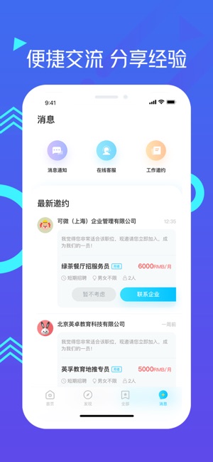 3、在线交流:提供在线聊天功能,方便用户与其他用户或招聘人员交流,让求职更方便。平台支持文字、语音和视频沟通,用户可以随时与雇主确认工作细节,也可以在社区中向有经验的用户请教求职技巧。