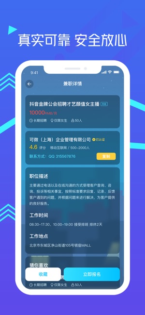 4、入驻企业实名认证,严格审核企业信息,筛选每个兼职招聘岗位,多重监管机制和保障计划保障用户权益。平台与工商部门数据对接,可以实时验证企业资质,确保招聘方的合法性。