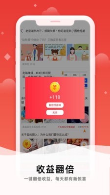 1、独创"阅读即收益"模式,用户浏览文章每分钟可获得2-5枚金币,热门专题还有双倍奖励时段。2、视频板块汇聚搞笑短剧、生活妙招等垂直领域内容,支持离线缓存和倍速播放,每观看3分钟可获得金币奖励。3、师徒系统设计新颖,拜师成功即可获得888金币启动礼包,徒弟每日阅读更能为师傅带来10%收益加成。4、收徒机制设置多级奖励,每成功邀请一位新用户可获得基础奖励,徒弟后续活跃度还能带来持续分成。5、实时更新的收益排行榜单,展示日榜/周榜TOP100用户数据,激发良性竞争氛围。6、社交裂变功能强大,分享链接被点击即可获10金币,好友完成注册再得200金币,邀请5人更可解锁专属福利。