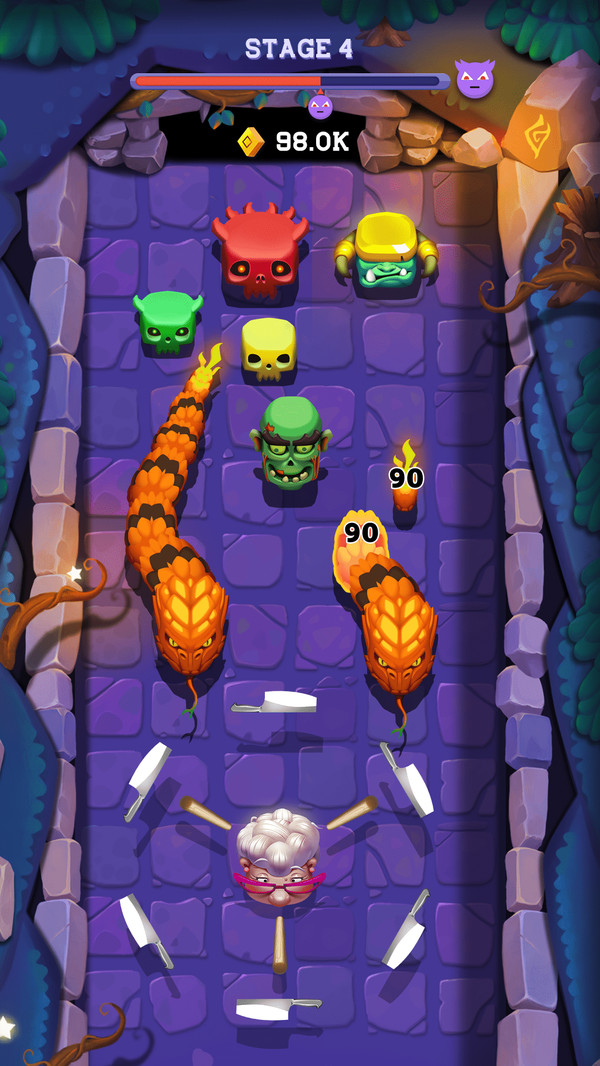 3、后面的怪物会越来越难消灭掉,你一定要配合好奶奶发挥出飞刀的真正实力!游戏后期会出现拥有特殊能力的精英怪物和巨型Boss,它们会使用护盾、分身、瞬移等技能,玩家需要针对不同怪物弱点调整战术。团队协作和精准操作将是制胜关键。