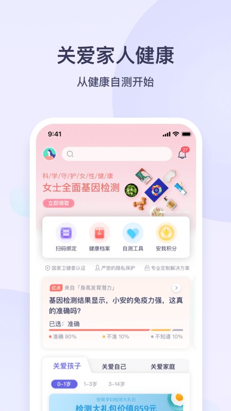 作为国内领先的基因健康服务平台,安我生活依托安我AndAll科研中心强大的技术实力,开发了涵盖母婴健康、女性护理、家庭生活方式等9款专业检测产品。平台采用国际领先的基因测序技术,结合中国人群特征进行本土化研发,为用户提供个性化的健康管理方案。通过基因检测数据解读,帮助用户了解自身健康风险,制定预防性健康计划。同时平台还提供专业的育儿知识库、在线专家咨询等增值服务,让科技真正服务于每个家庭的健康需求。