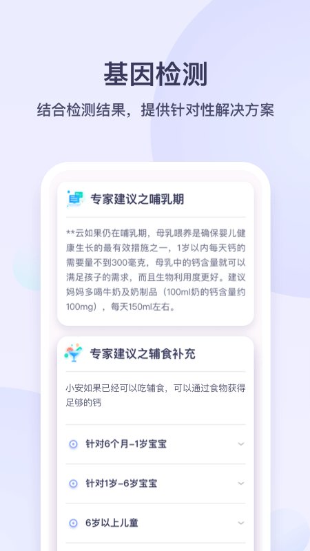 1.个人专属报告,定制解决方案,送免费专家咨询:基于用户基因数据生成个性化健康报告,并提供专业解读服务。报告涵盖营养需求、运动建议、疾病风险等全方位健康信息,用户还可享受三次免费专家咨询服务。