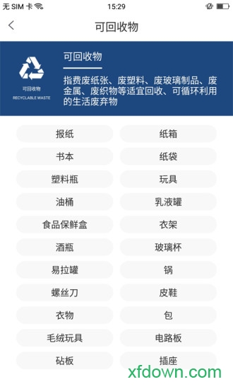 【可回收物】-适宜回收、可循环利用的生活废弃物。主要包括废纸、塑料、玻璃、金属和布料五大类,如报纸、易拉罐、玻璃瓶等。这些物品经过专业处理后可以重新变成生产原料,实现资源循环利用。