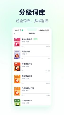 单词词库划分了多个不同的阶段包括有中考、四六级等类型。所有词库都按照学习难度和考试要求进行科学分级,从初级到高级循序渐进。用户可以根据自身英语水平选择适合的词库开始学习。