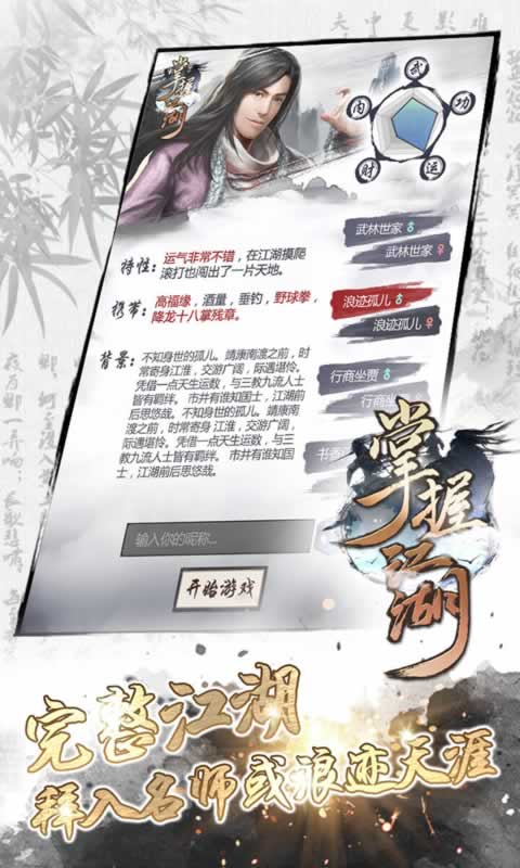 《掌握江湖》H5手机版震撼上线,带你体验不一样的武侠世界!游戏中你可以选择四位身世迥异的少年开启江湖之旅,以宋辽之争为历史背景,在保家卫国的同时书写属于自己的武林传奇。作为文字武侠游戏的开创者,本作不仅完美还原了经典武侠玩法,更创新性地融入多段轻功系统、门派心法传承等特色内容,让你感受最纯粹的江湖气息。