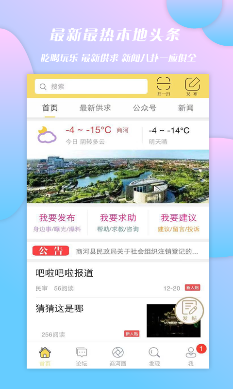 全新升级的2.0版本带来更优质的使用体验!本次更新重点打造了"商河人自己的圈子"特色功能,为用户构建了一个集生活服务、二手交易、房屋租售、社区交流于一体的综合平台。新增的娱乐八卦板块让用户能够及时了解本地热点话题,参与讨论互动。同时,优化后的界面设计更加符合用户操作习惯,信息分类更加清晰明确,让您能够更快捷地找到所需内容,享受更流畅的使用体验。