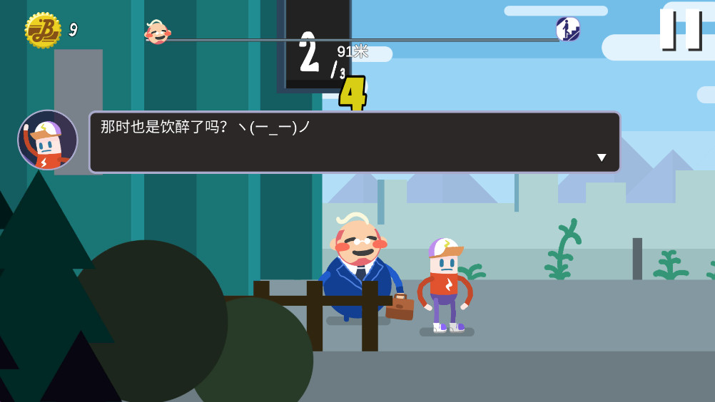 5.老爸的醉酒状态会随时间加深,行动轨迹越发飘忽,一旦触碰障碍就会立即游戏结束。玩家可通过收集醒酒道具暂时稳定父亲状态。