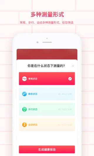 3、【不同的测量形式】提供四种专业测量模式:常规状态适合日常监测,静息状态评估基础心率,步行状态检测日常活动心率,运动状态追踪锻炼强度,每种模式都配有详细说明指导用户正确使用。