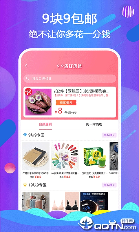 4、精选九块九包邮:每天精选超值9块9包邮商品,9块9包邮,全国轻松买。特别设立的"捡漏专区",汇集了各大平台的特价清仓商品,用极低的价格就能淘到实用好物。