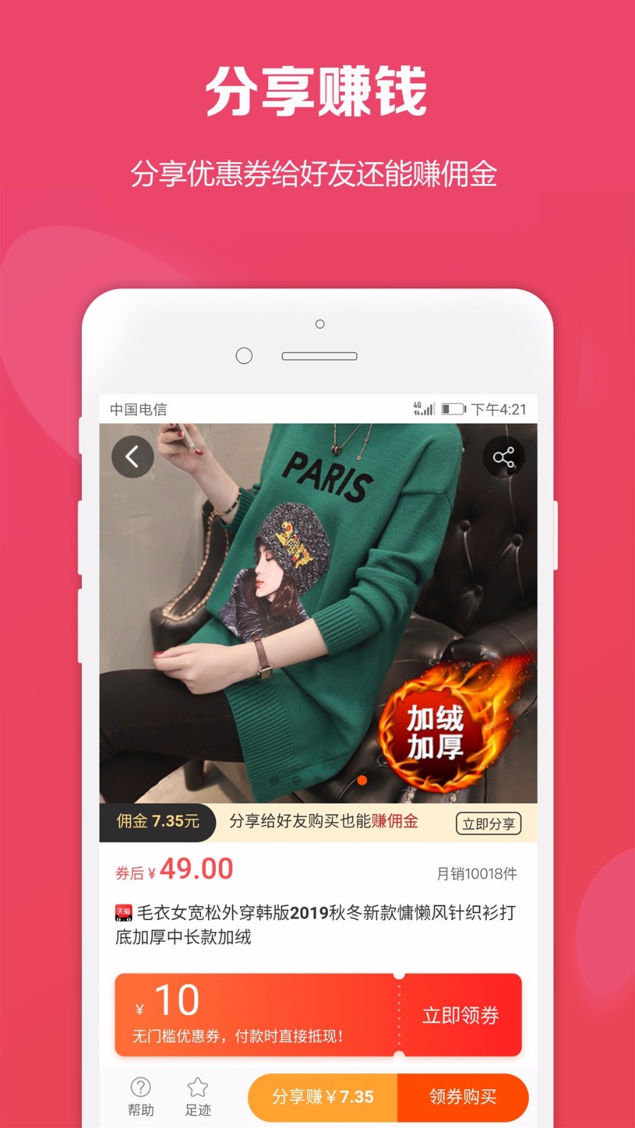 分享赚钱:分享优惠券给好友还能赚佣金。独创的三级分销体系,用户分享的优惠券产生交易后,最高可获得15%的推广佣金。热门商品的爆单奖励计划让赚钱更轻松。