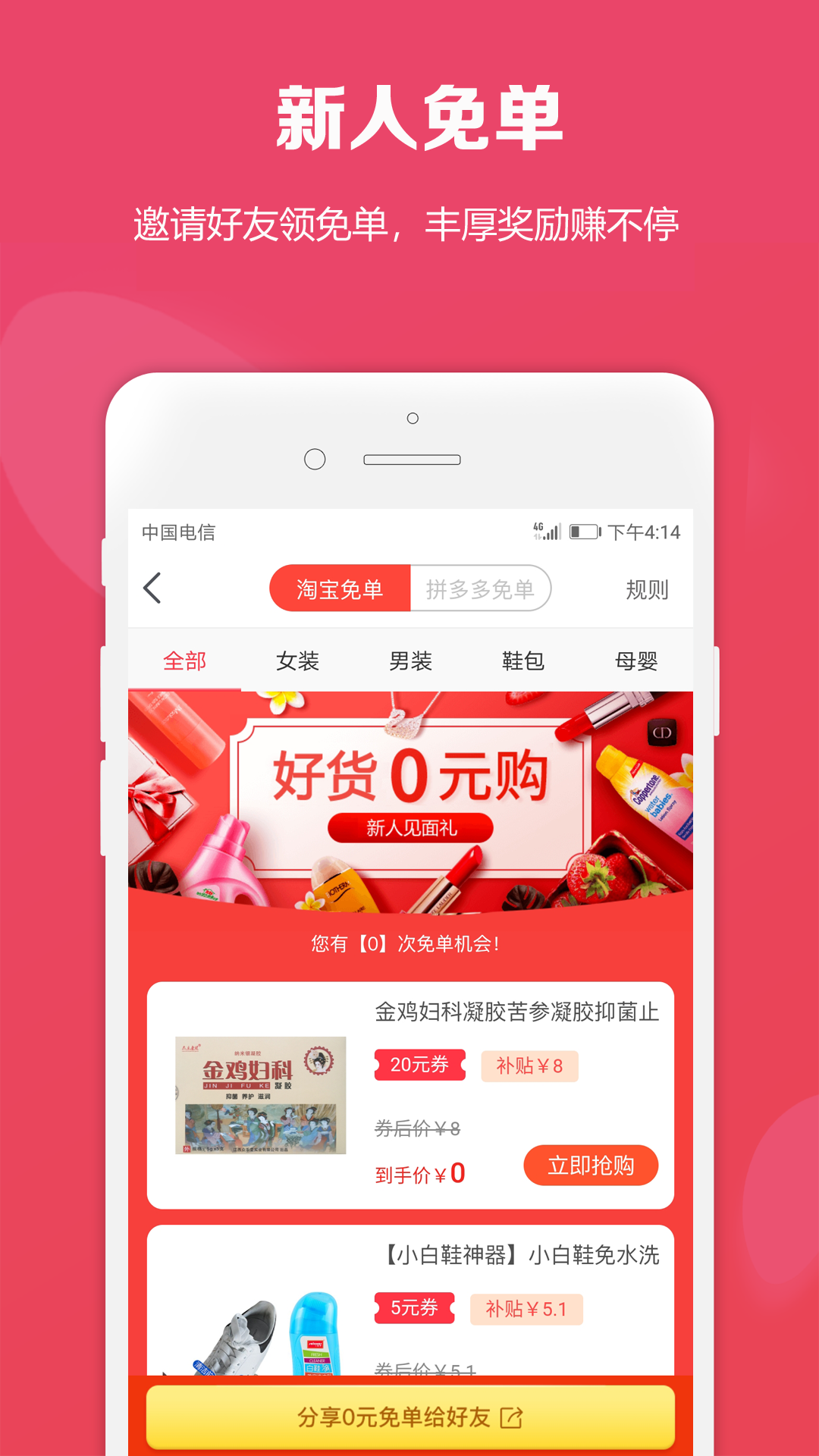 新人免单:邀请好友领免单,丰厚奖励赚不停。新用户注册即可获得3张无门槛免单券,邀请好友还能叠加奖励。每成功邀请一位好友,双方都可获得额外购物津贴。