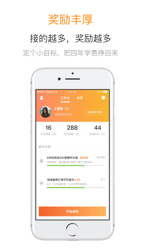 【奖励丰厚】 平台采用阶梯式奖励机制,接单量越多奖励越丰厚。通过持续接单,你甚至可以实现"把四年学费挣回来"的小目标。每完成一单都能获得即时收益,让努力看得见回报。