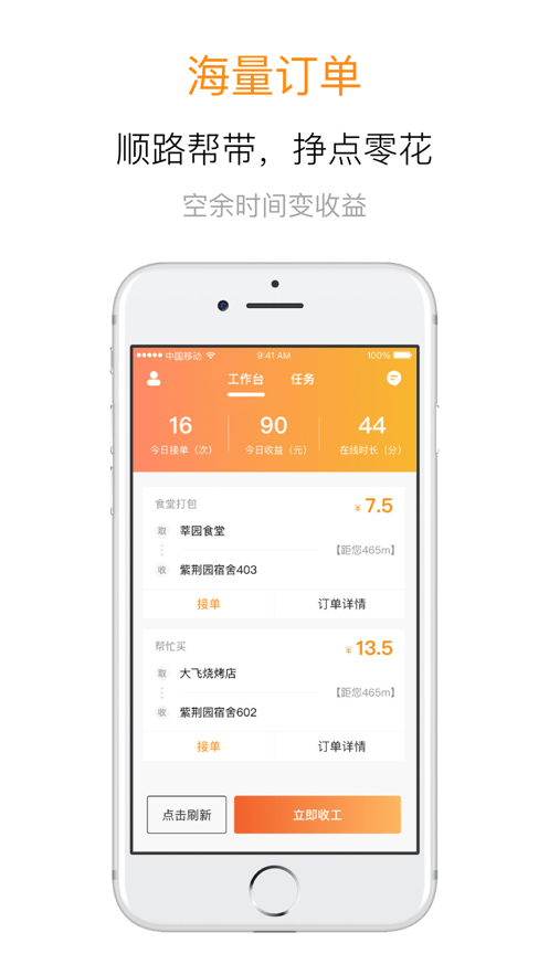 【海量订单】 校园内配送需求旺盛,平台每天都有大量订单等待接取。无论是帮同学带饭、取快递,还是代办事务,都能轻松赚取零花钱。让你的空余时间变成实实在在的收益来源。