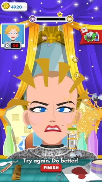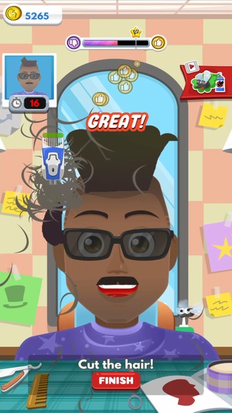游戏采用夸张搞笑的卡通画风,各种滑稽表情和魔性动画让人忍俊不禁。丰富的美发项目包括基础修剪、时尚染烫、胡须造型等,还能使用喷枪、电推剪等专业工具。操作方式简单却富有挑战性,需要稳定控制手指滑动轨迹来完成精细剪裁。随着等级提升,可解锁荧光发色、3D雕刻等高级美发技术。