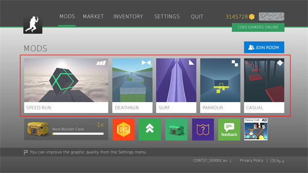 1、破解免费获得9999箱子:游戏内所有箱子均可免费开启,数量固定为9999个且不会减少,让你畅享无限开箱乐趣。2、去除所有广告:彻底移除游戏内所有弹窗广告和视频广告,打造纯净无干扰的游戏环境。3、修改无限金币:初始即获得大量金币资源,可自由购买各类道具和装饰物品。4、速度上限提升:角色移动速度突破原版限制,让跑酷体验更加刺激畅快。5、跳的更高:调整跳跃高度参数,使角色能够轻松跃过更高障碍物,挑战更复杂的关卡地形。