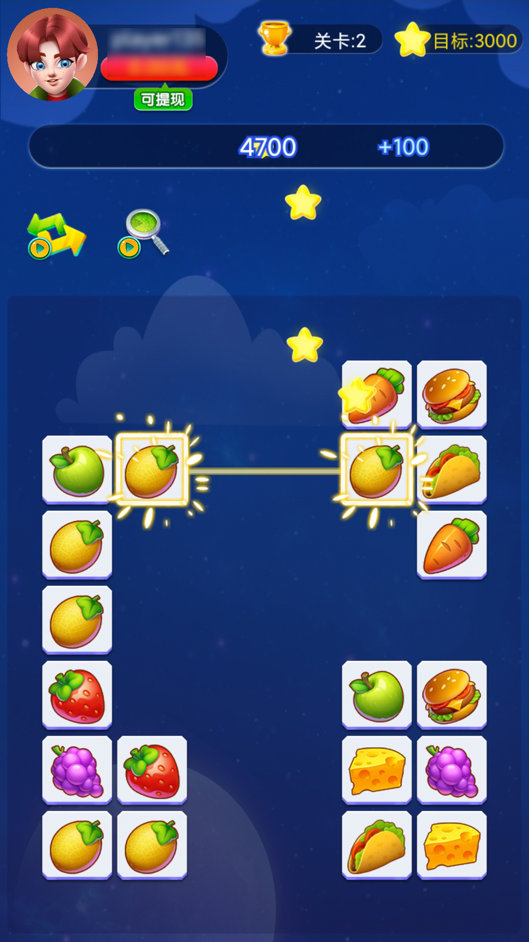 1、游戏创新性地将传统连连看玩法与水果主题完美结合,不仅要求图案颜色匹配,还需要形状完全一致,大大提升了游戏的挑战性;