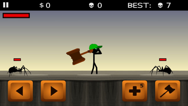 游戏中设计了大量不同种类的蜘蛛敌人,它们会从四面八方缓缓逼近玩家操控的火柴人。这些蜘蛛不仅体型庞大,移动速度也会随着关卡提升而加快,给玩家带来持续的压力。特别值得注意的是,蜘蛛的攻击力非常惊人,一旦被咬到就会造成严重伤害。为了对抗这些危险生物,火柴人配备了威力巨大的重型锤子,每次成功命中都能对蜘蛛造成可观伤害,但需要把握好攻击时机和角度。