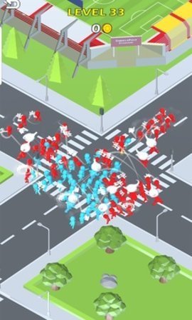 《干就完事》是一款主打轻松欢乐的休闲竞技游戏。游戏摒弃了复杂的操作和繁琐的技能系统,采用"简单粗暴"的战斗理念,让玩家能够快速上手享受纯粹的格斗乐趣。游戏设定在一个色彩鲜明的城市地图中,玩家将分为红蓝两大阵营展开对抗。作为阵营领袖,你需要通过灵活走位在城市中游走,不断吸纳中立角色壮大自己的队伍。当双方势力相遇时,无需任何战术策略,直接带领你的橡皮人大军冲上去就是干!这种简单直接的战斗方式反而带来了意想不到的欢乐效果,让每场对决都充满变数和惊喜。