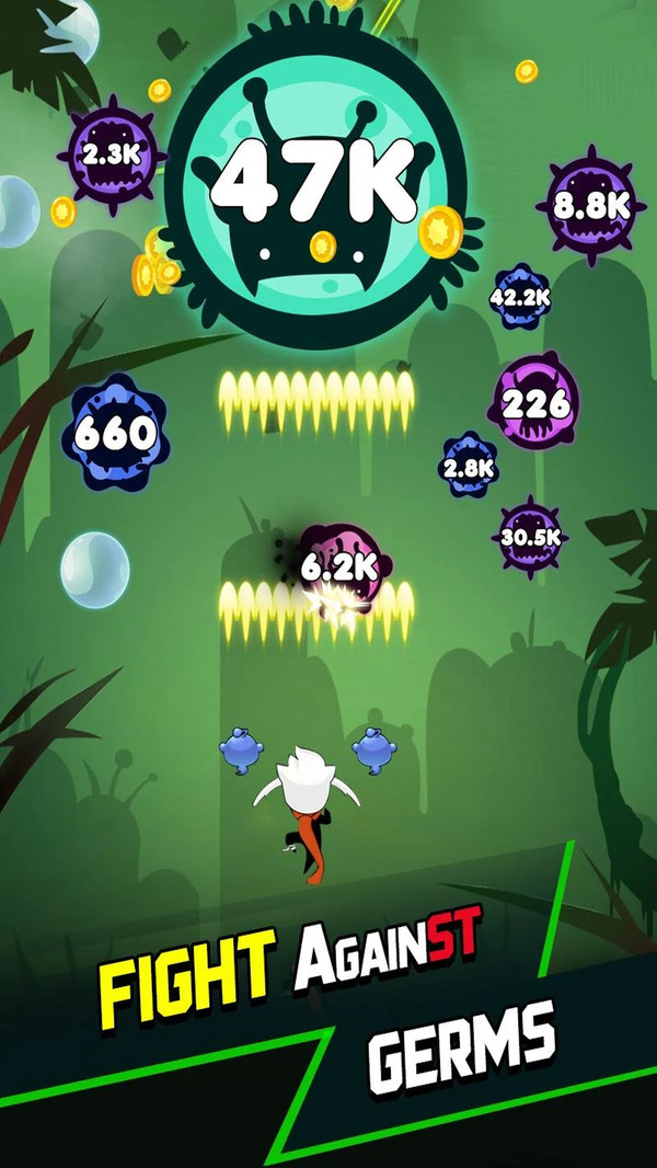 2、关卡越往后,细菌的数量会增多。游戏采用智能刷怪机制,后期关卡不仅敌人数量激增,还会出现拥有特殊能力的精英细菌,考验玩家的应变能力。
