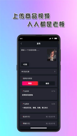 2、每个人都能上传商品视频,人人都是老板,门槛非常的低,可以快速的赚取到第一桶金。平台为个人卖家提供了完善的入驻流程和运营工具,零基础用户也能轻松开店,通过短视频带货实现创业梦想,创造额外收入来源。