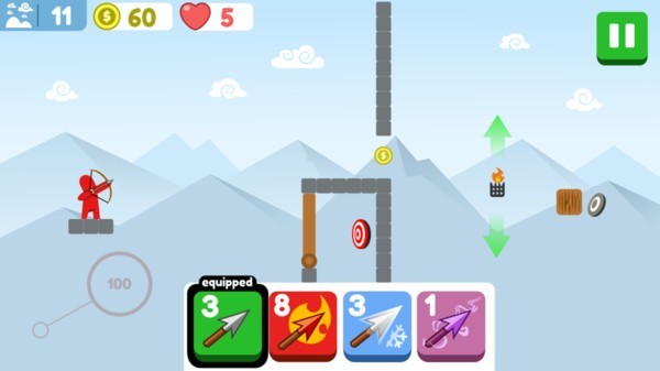 2、使用金币可以提升角色能力,提高解锁技能,轻松突破障碍,用最少的箭获得最多的分数。完善的成长系统让玩家不断获得新能力,从基础射击到掌握特殊技巧,体验角色成长的乐趣。