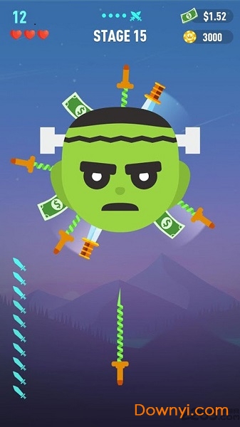 游戏核心玩法看似简单却暗藏玄机。玩家需要在有限飞刀数量内尽可能多地命中靶盘,同时避开炸弹等危险区域。创新的血量系统让游戏更具策略性,击中炸弹会损失生命值,但可以通过命中爱心标志恢复。三星评价系统为完美主义者提供额外挑战,达成条件包括命中特定区域、剩余飞刀数量等。游戏还设有Boss战模式,面对特殊造型的巨大靶盘,玩家需要使用特殊技能才能通关。每日任务和成就系统为玩家提供持续的游戏动力,完成指定目标可获得稀有飞刀皮肤和大量金币奖励。