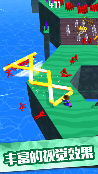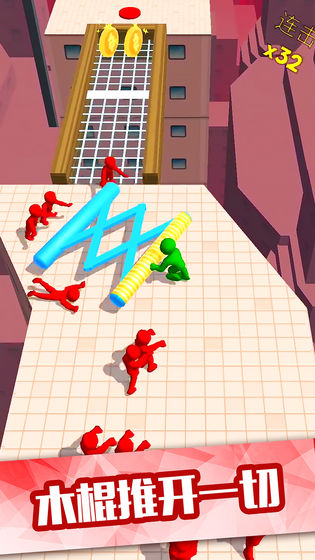 2、玩家需要操控小人推动木棍,向关卡终点前进。在这个过程中,要用棍子推开所有阻挡道路的敌人,将他们统统推入水中。游戏采用物理引擎模拟真实碰撞效果,每一次推敌都会带来不同的物理反馈,增加了游戏的可玩性和趣味性。