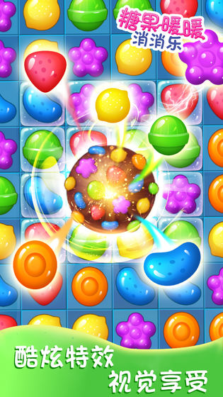 1、游戏为每一次消除都设计了华丽的特效动画,当糖果被消除时会绽放出绚丽的视觉效果,配合清脆的音效,让玩家获得满满的成就感。