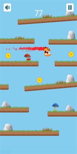 1、玩家可以通过点击屏幕控制南瓜跳跃,长按可实现更高更远的跳跃。游戏提供了多种有趣的道具,如弹簧鞋可以让你直接越过障碍,磁铁可以自动收集金币,合理使用这些道具能大大提升通关效率。