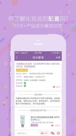 提供了30余万种化妆品成分的查询和1万余种成分的详细说明,与药监局备案数据同步,部分成分说明是配方师和研发人员手动录入。全成分表查询,美丽修行化妆品安全星级算法查看产品成分,孕妇、敏感型肤质的护肤管家。支持扫码查询功能,只需扫描产品条形码即可获取完整成分信息。我们还开发了成分对比功能,可同时比较多款产品的成分差异,帮助您做出最优选择。