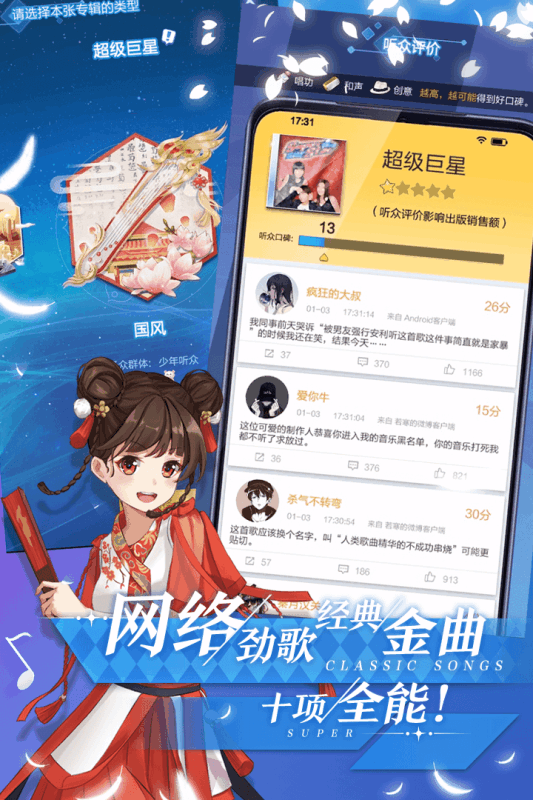 游戏独创的"音乐工坊"系统让你化身全能制作人,从作词作曲到编曲混音,从MV拍摄到宣传企划,全程参与专辑制作。500+风格各异的音乐片段可自由组合,搭配不同偶像的声线特点,能创造出无限可能的音乐作品。每张专辑发布后都会获得专业乐评和粉丝反馈,根据市场反应调整下次创作方向。特别加入的"打歌舞台"玩法,让偶像们能在炫丽的3D舞台上展现魅力,实时收集观众应援值,体验打榜冲冠的刺激感。随着艺人成长,还能解锁万人演唱会、音乐颁奖礼等大型活动。