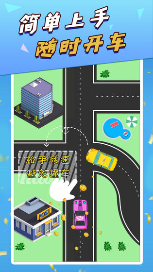 3、创新的简易操作模式让玩家轻松上手,点击屏幕即可加速行驶,松开手指自动减速,配合灵敏的方向控制,让你在城市道路间自如穿梭,同时需要时刻保持警惕避免与其他车辆发生碰撞。