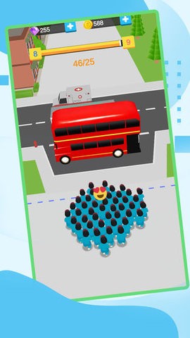 2、精心设计的随机生成系统让每次挑战都充满新鲜感,道路上分布着形态各异的小人,需要灵活操控角色穿梭其中。通过精准滑动屏幕收集更多同伴,带领他们突破重重阻碍向公交车进发。