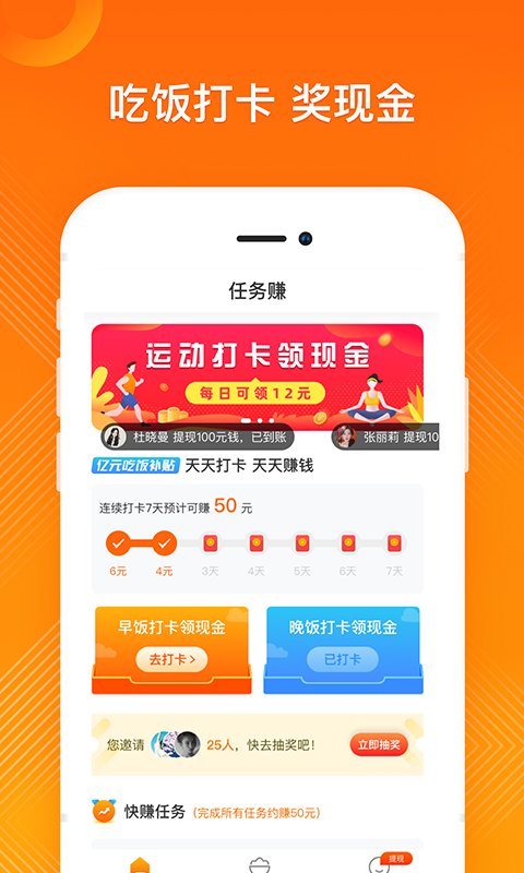 每天吃饭打卡领现金,连续7天打卡得50元。系统会自动记录您的用餐时间,只需在指定时段完成打卡即可累积奖励。坚持打卡还能解锁额外成就奖励,让您的每一餐都更有价值。